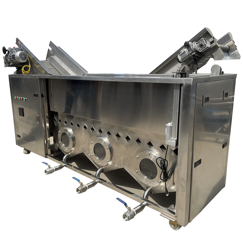 連續(xù)式油水混合油炸設備由一條在恒溫油槽中的不銹鋼網格傳送帶構成 ,由雙網帶無級變速輸送系統(tǒng)、主油槽箱與輔助油箱組成的外循環(huán)過濾系統(tǒng)、PID油溫自控儀、XSM轉數(shù)線速儀表以及繩索提升裝置等組成,采用多種加熱方式給食用油加熱(電加熱或燃氣加熱)。食品被緩慢地定量送入油中,下沉到浸泡在油中的傳送帶上 ,食品在炸熱和炸熟時呈懸浮狀。則被壓在另一條傳送帶下 ,食品油炸、上料及卸料采一條用傳送帶,減少中間環(huán)節(jié),卸料時斜坡提升使多余的油流回油槽中。