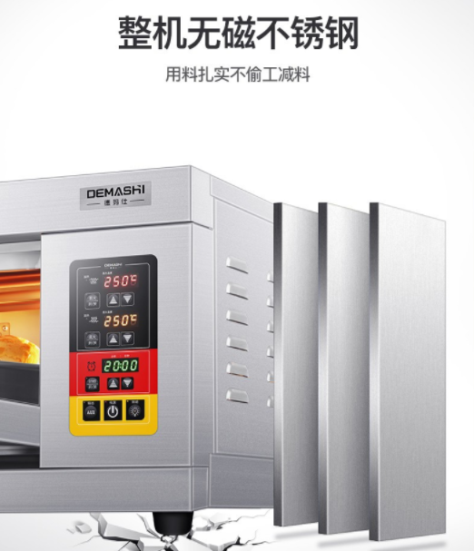 溫度范圍400度,烤箱的材質(zhì)材質(zhì)就是前面不銹鋼,后面烤漆板, 內(nèi)部免漆板   ,保溫層9公分厚,帶6個記憶按紐,第一次設(shè)置好之后直接按記憶按鈕1、2、3、4、5、6,帶記憶、帶定時電腦版分層式電烤箱 紅外線電熱管。烤爐擁有多種規(guī)格:1層2盤、2層4盤、3層6盤、3層9盤,供您選擇。電烤箱要根據(jù)您現(xiàn)在使用的額定電壓發(fā)貨的,兩相電是220V,三相電是380V。建議用6平方線!60A空氣開關(guān)!一般商用的電器都是沒有插頭,為了更好保護設(shè)備和安全需要用到空氣開關(guān),自備電線跟水管的,我們提供接線視頻的!